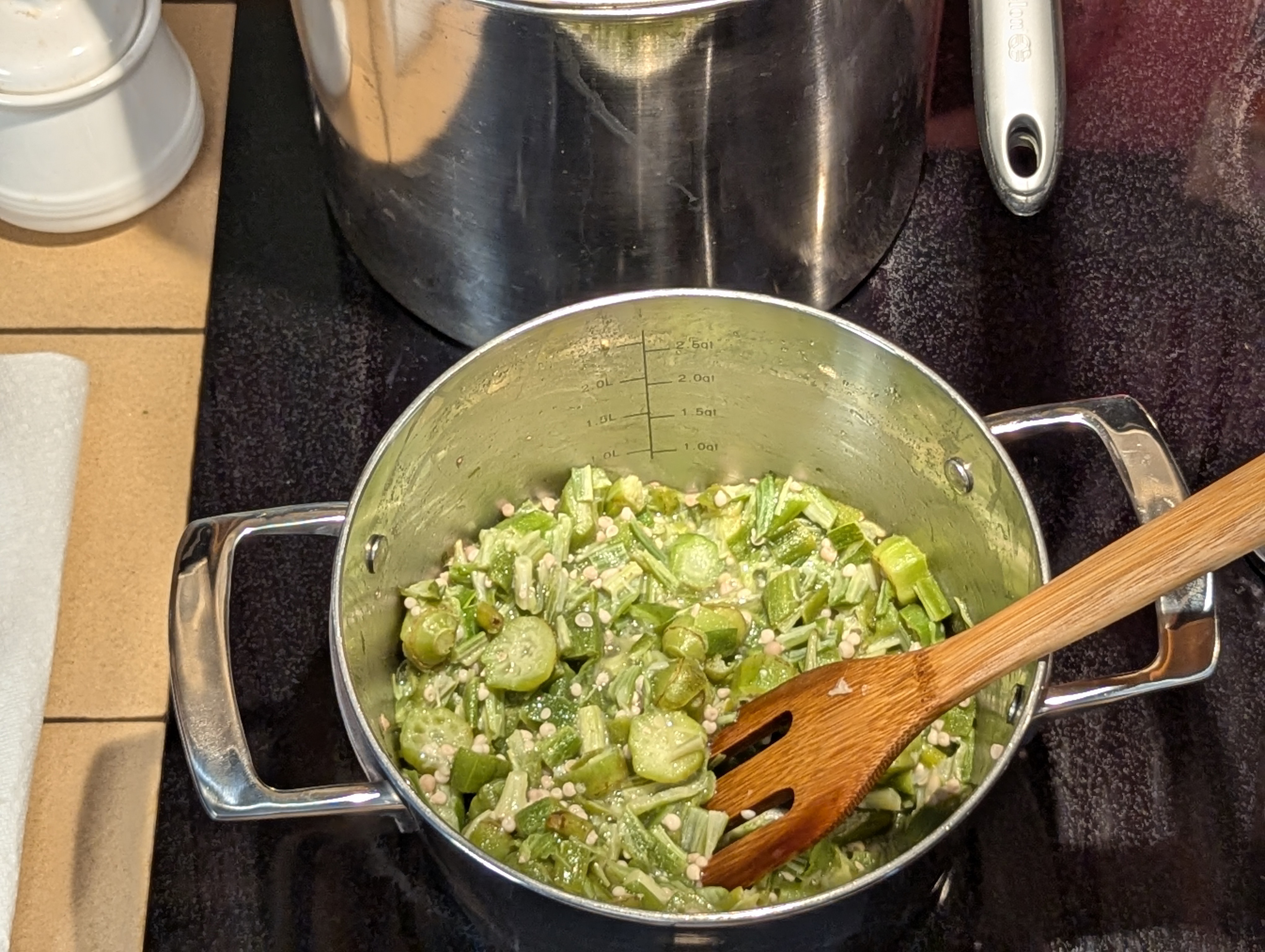 - Cook frozen okra in a separate pot with EVOO until no longer stringy.